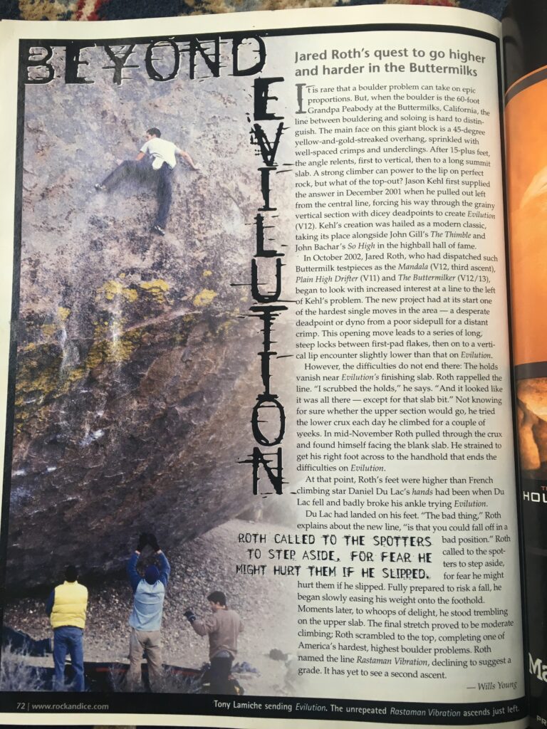 “I figured eventually someone would send the obvious sit start, but I should make sure the top 65 feet go before I made it any harder. I only was able to do the stand because my girlfriend at the time went and got food stamps so we could stay another couple weeks. I never got back out there till probably 20 years later or so.